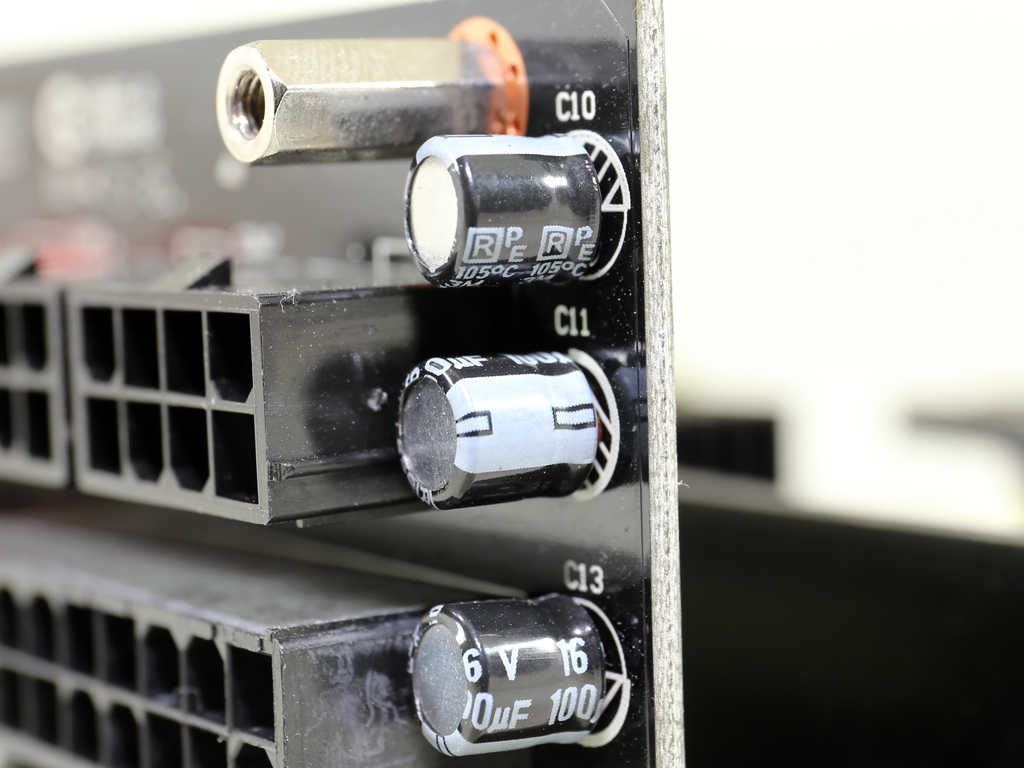 Both polymer (Teapo) and electrolytic (Chemi-Con, Rubycon) caps filter the rails on the secondary side. All electrolytic caps are rated at 105 degrees C for increased lifetime.