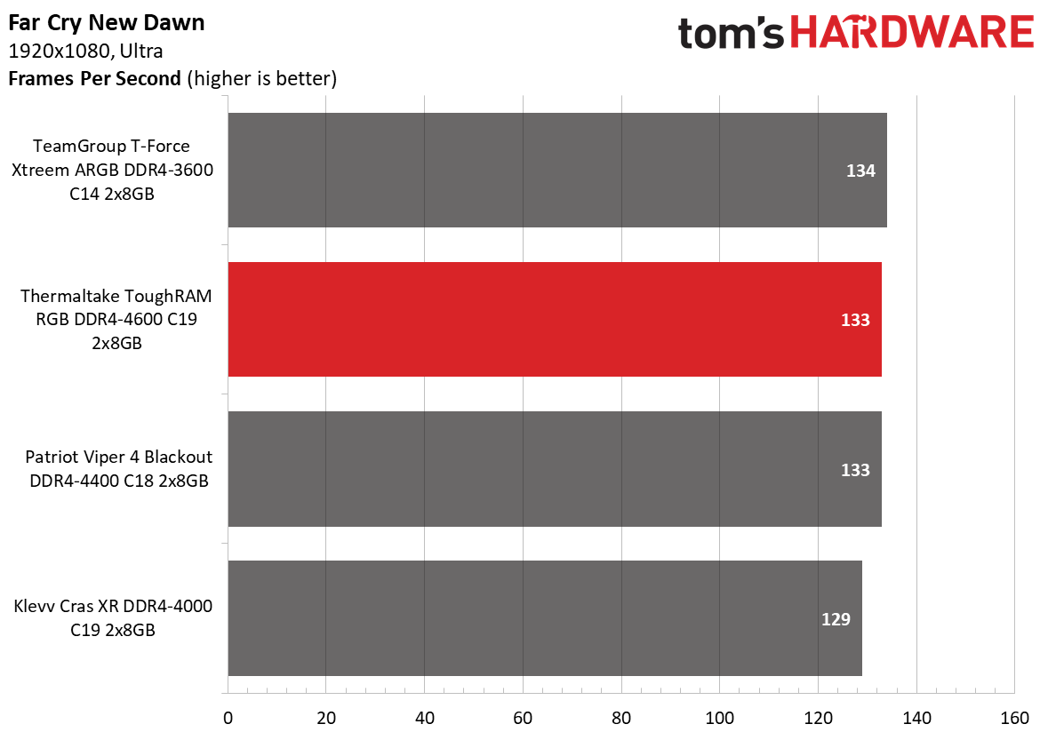 The ToughRAM RGB kit performed better than expected on the Intel platform. The memory kit was only second in CPU and gaming performance to Patriot's Viper 4 Blackout DDR4-4400 C18 memory kit.