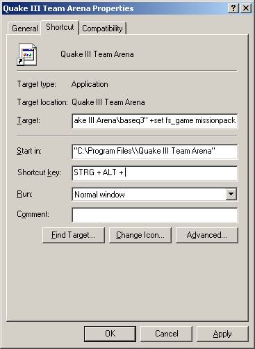After installing Quake III Team Arena, the program should be started with the so-called Mission Pack. To do so, you must add the following to the start up shortcut: '+set_fs_missionpack'.