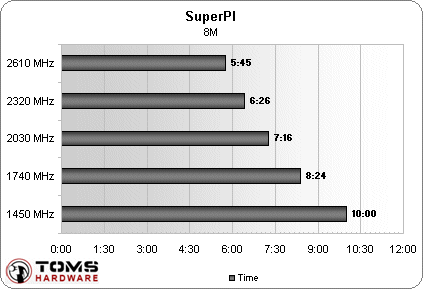 By looking at the graphs, one could easily be fooled into believing that the effects of increasing the CPU clock frequency are bottlenecked by the 290 MHz memory speed at higher CPU speeds, because the performance increase shrinks as the CPU clock speed goes up. Keep in mind, though, that the CPU multipliers used are 5, 6, 7, 8, and 9, which gives us actual clock frequency increases of 20%, 16.6%, 14.3% and 12.5%. In SuperPI, the resulting performance increases are 19%, 15.6%, 13.5% and 11.9%, so things do scale perfectly.