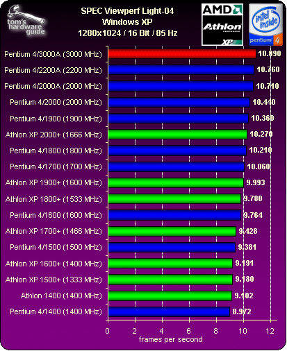 In the Lightscape benchmark, the Intel Pentium 4/3000 is clearly ahead of the Pentium 4/2200.