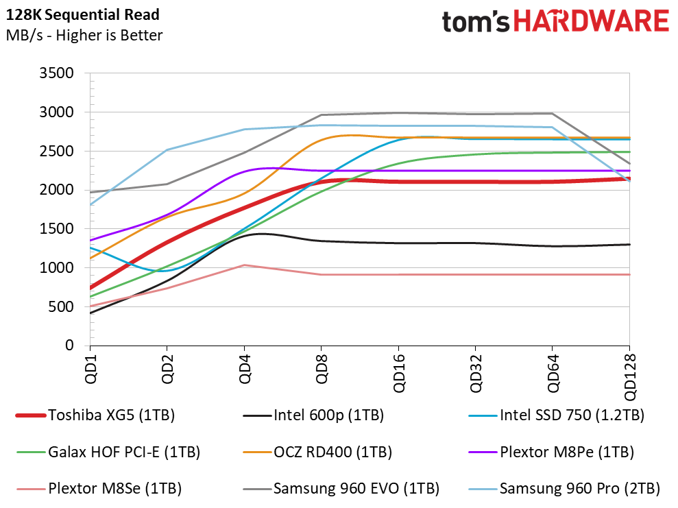 The XG5 is still below 1,500 MB/s at queue depth (QD) 2, which is slower than the OCZ RD400. The RD400 arrived well after the XG3 OEM model shipped and includes an optimized NVMe driver. Currently, the XG5 doesn't have an optimized driver.