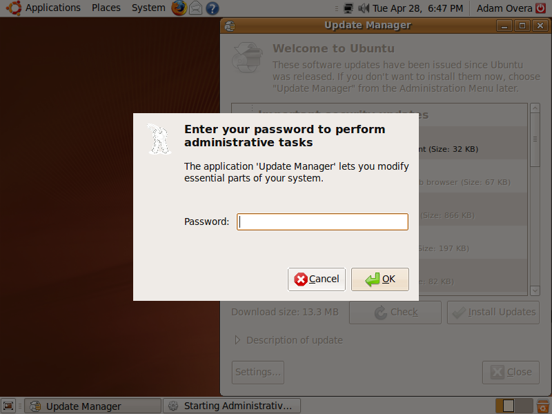 The screen will shade and you will be prompted to enter your password. This will happen every time you do an activity that requires changes to be made to system files.