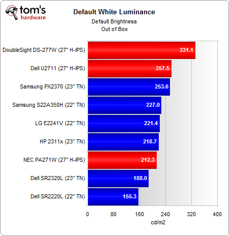 Right out of the box, all three 27" IPS-based displays perform rather well in producing bright whites. DoubleSight's DS-277W leads the pack, but then it yields very poor blacks, which is why it suffers when we calculate contrast ratios.