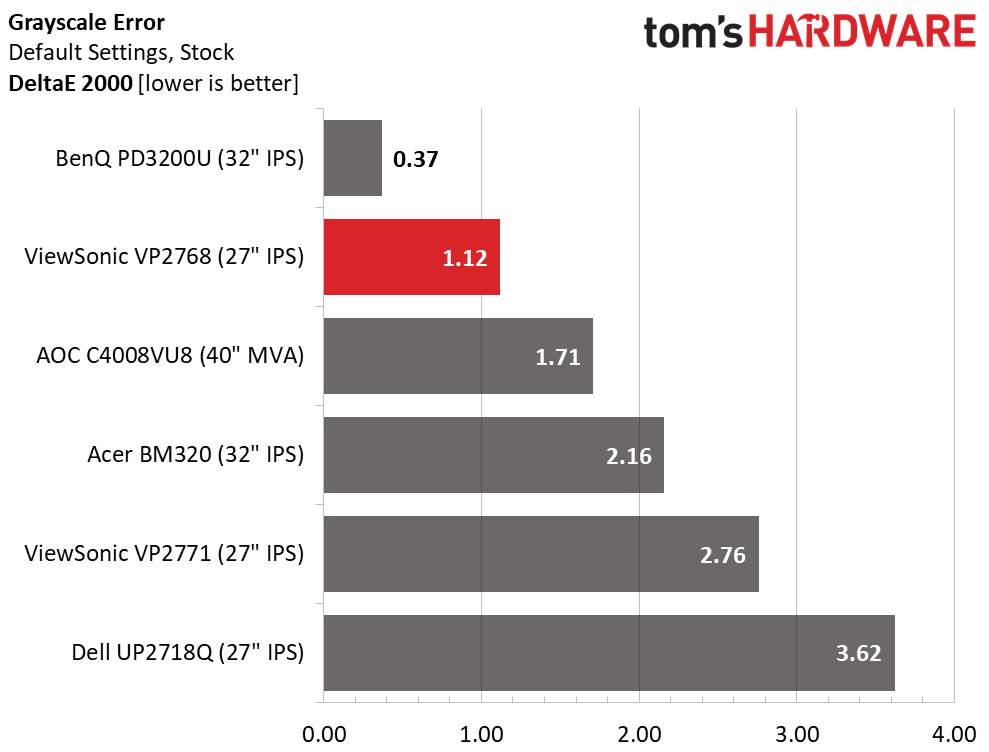 We left the sRGB result out of the comparison, but if it were there it would top the chart at .81dE. Calibrating the Custom mode takes the average from 1.09 to .98dE. So regardless of how you choose to set up the VP2768, it wins the color accuracy contest over some very impressive displays. At this point, you may be thinking it’s OK to save the $70 and go with the VP2768 over the VP2771. The latter’s 10-bit native panel might be a deciding factor for some, but performance is certainly not.