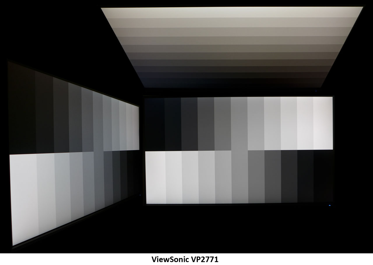 Though ViewSonic doesn’t advertise it, the VP2771 is clearly using an AHVA panel. The side-angle photo shows minimal light falloff and only a slight shift to blue. And you can easily see all the brightness steps including 10 and 0%. Top-down views show an obvious red shift, but again, the dark steps are still distinguishable from each other. In the LCD world, it doesn’t get much better than this.