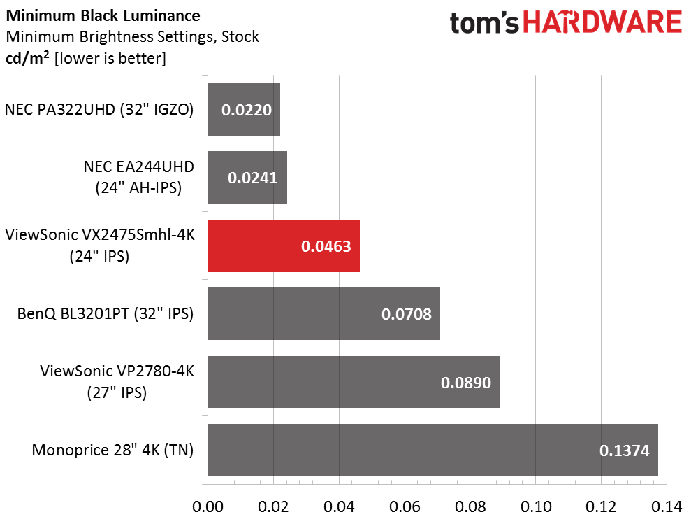 Until we get to measure an Ultra HD VA panel, we won't see superlative black levels here. ViewSonic does take the prize in today's group however, with an excellent .2936cd/m2 measurement.