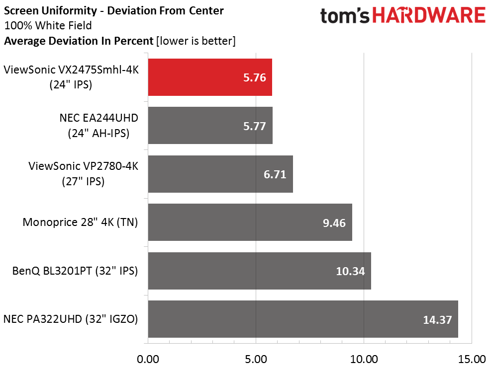 Our sample boasts seriously good uniformity in both tests. Only four monitors out of the 70 or so in our database have returned a better black field result. And 5.99 percent is well below the point where you'd see any light bleed or hotspots.