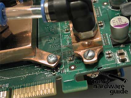 The card is cooled with efficient heat dissipating blocks, which are connected to one another and mounted on the card. Installing the tubes is easily done through the plug-in connections. However, you should be careful not to damage the card during installation. The connections can be freely rotated. With the water circuit, the user has the option of cooling the memory first and then the GPU, or vice versa.