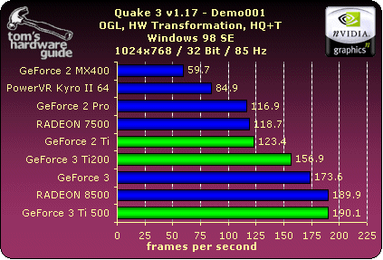 In 1024x768, Ti500 and R8500 lead the group, with the GeForce3 close at their heels. Following at a respectful distance, we find the Ti200. The GF2 Ti and the R7500 are left to duke it out at the rear of the field. The same overall picture is repeated in 1600x1200. The only variation here is that the smaller RADEON is able to edge out the GF2 Ti.