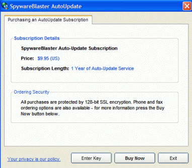 The only part of SpywareBlaster that is not free is the AutoUpdate feature. For just $9.95, SpywareBlaster will automatically update itself for a year. It's a very small price for this service, and it helps the creators pay for bandwidth and future development costs. Of course, this is completely optional and the software is completely functional with or without a paid subscription to the AutoUpdate service.