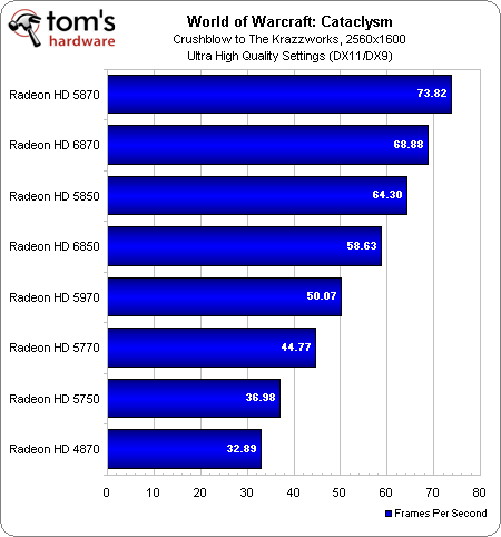 Now's probably a good time to point out the Radeon HD 5970 languishing in the middle of our charts. AMD claims World of Warcraft is supported by CrossFire, but all of our testing (and a good number of posts to Blizzard's forums) suggest that this game simply will not scale beyond one GPU, even when the GPUs are built onto the same card. As a result, what should be the fastest board here falls to the center of the pack.