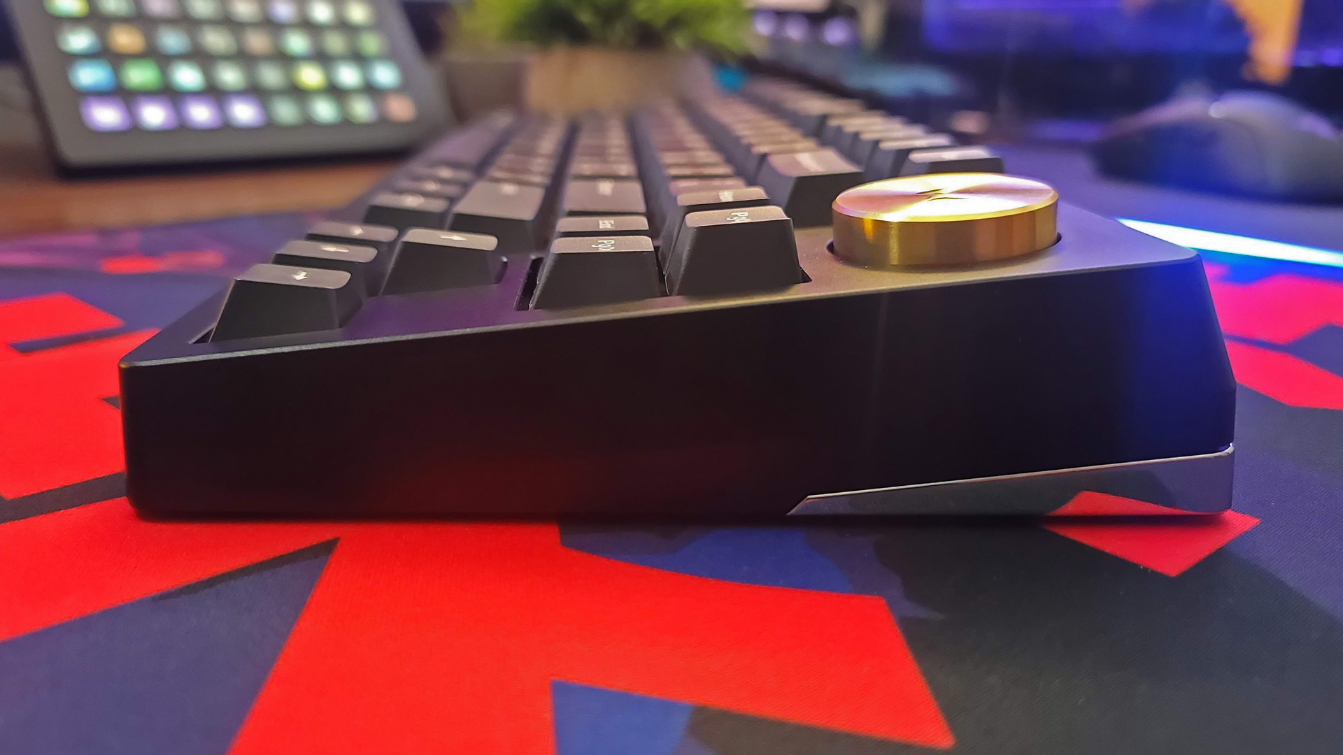 The Mammoth75 is a 75-percent keyboard that breaks the mold with its layout. Like most 75-percent keyboards, it lacks a dedicated Numpad but includes a full row of Function keys and a dedicated arrow cluster. Most keyboards using this layout include a single column of navigation and editing buttons above the arrows, but the Mammoth uses a 2x2 grid, making it only one column narrower than a traditional TKL, but that added width makes room for the oversized volume knob that lends it its unique look.
