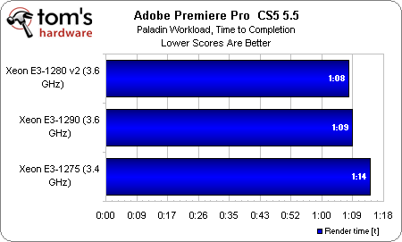 The Xeon E3-1280 v2 is the fastest processor in our Premiere Pro workload, but only by one second.