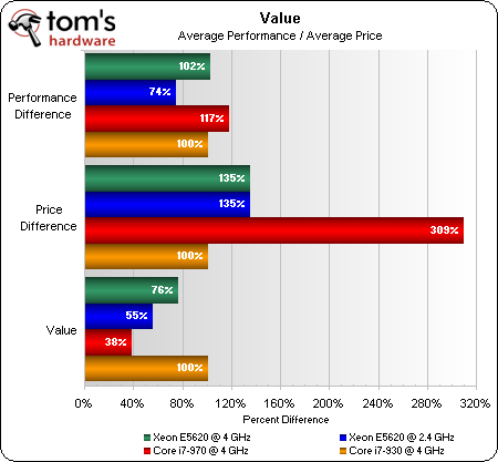 Because it’s sold at such an attractive price, the Core i7-930 at 4 GHz actually gives you the best value of the group. Remember, though, that it takes a bit of coaxing to get this retail chip stable at 4 GHz—including one of the highest-end air coolers available. Remember also that the Xeon E5620 can actually be coaxed up to 4.2 GHz or so if you’re willing to pull out the stops and break the 220 MHz BCLK ceiling. So, this chart doesn't tell the whole tale. A Xeon E5620 will likely buy you more performance than the Core i7-930, which we'd scale back to 3.73 GHz anyway.