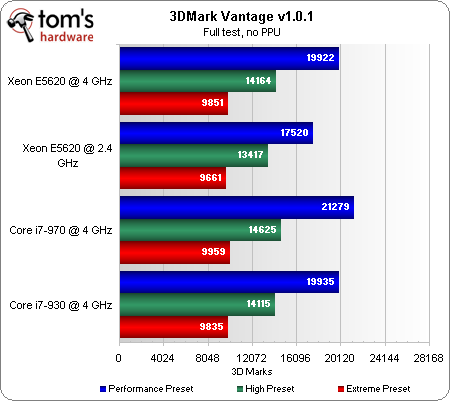 Sure enough, 3DMark Vantage rewards the hexa-core platform, even if a vast majority of actual games fail to exhibit performance gains to match.