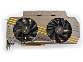 Visually, Zotac's AMP! Omega is undeniably distinct. The dark gray brushed metal finish with yellow accents delivers a serious, militaristic impression. A large heat sink bridges the top of the tall PCB to the fan shroud, and the back plate is recessed to showcase the power boost-branded capacitors and OC+ module.