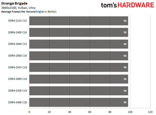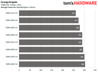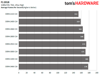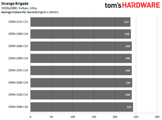 This time around DDR4-3200 C14 delivers the best performance in Shadow of the Tomb Raider at 1920x1080 with an 18.75 percent improvement in average frames per second. For Strange Brigade, DDR4-3200 C14 is faster with the DirectX 12 API while DDR4-3466 C16 is better with the Vulkan API. The DDR4-3200 C14 and DDR4-3466 C16 configurations tie in F1 2018, as both pump out 18.62 percent higher average frames per second.
