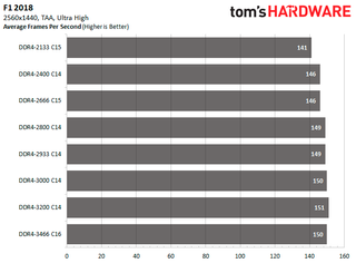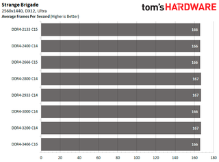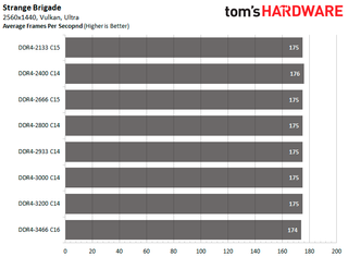 At the 2560x1440 resolution, DDR4-3200 C14 and DDR4-3466 C16 offer 10.99 percent better performance in Shadow of the Tomb Raider. But performance in Strange Brigade remains the same, regardless of memory speed and API. While in F1 2018, DDR4-3200 C14 provides up to 7.09 percent higher average frames per second.