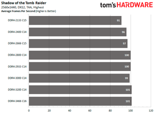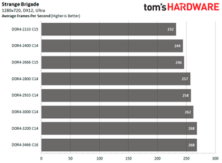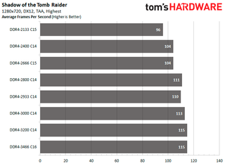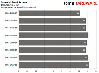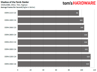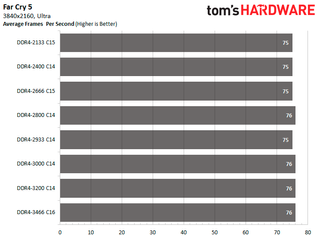 The back-and-forth fighting between both configurations continues with the Ubisoft titles. DDR4-3466 C16 manages to edge out DDR4-3200 C14 in Assassin's Creed Odyssey as the configuration is 15.49 percent faster than DDR4-2133. While in Far Cry 5, DDR4-3200 C14 comes out on top with an 11.96 percent improvement.