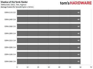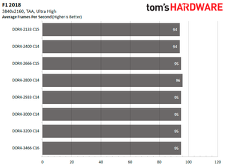 Faster memory has no impact on Shadow of the Tomb Raider and Strange Brigade at the 3840x2160 resolution. In F1 2018, the difference in performance between memory speeds is less than three percent. As for the two Ubisoft games, the difference between the fastest and slowest configuration is about 4.08 percent in Assassin's Creed Odyssey and less than two percent in Far Cry 5.